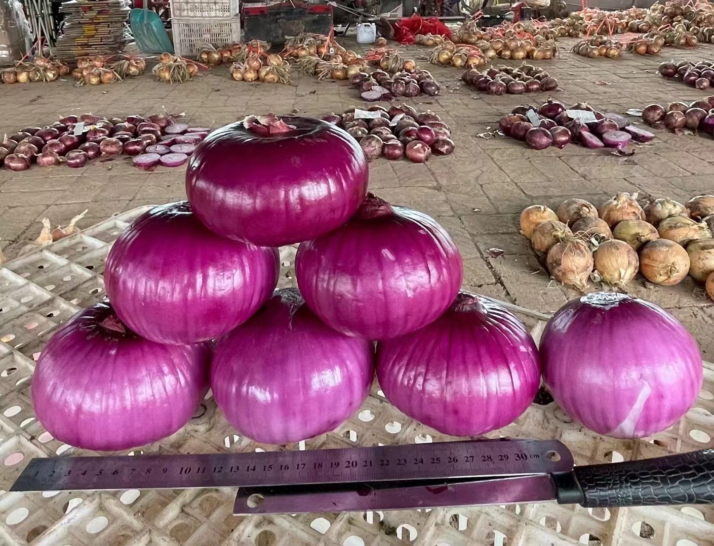 1、中日照中熟红皮洋葱,球形近正圆球形,单球重460克左右,每亩产量9000公斤左右。2、外皮较厚,干物质含量较高,耐储存。3、根系发达,植株生长健壮,叶片肥厚较直立,抗病性较好。4、冬季较耐低温,抗抽薹能力较强。